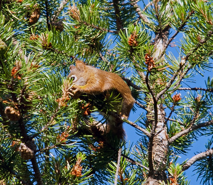 | Red Squirrel Foraging for Food in a 60 foot Spruce Tree. |